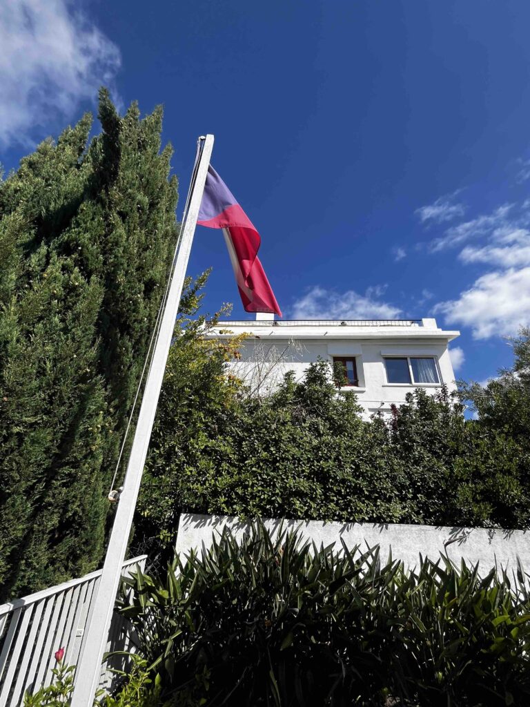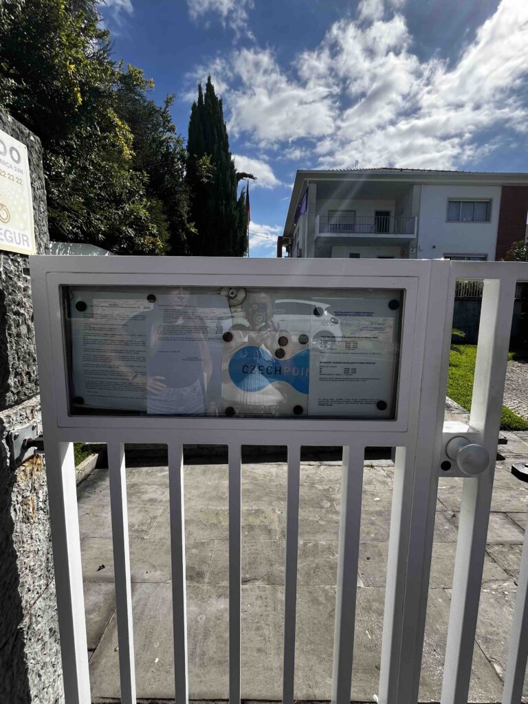 Slunce se odráží od bílých fasád, kolem voní čerstvě posekaná tráva a zpoza stromů slyšíme jen vzdálený šum města. Vyřizování pasu a ověření rodného listu v portugalštině probíhá hladce – objednání předem se opravdu vyplatilo, vlastně je to nutné. Formuláře, podpisy, milé úsměvy paní konzulky a její asistentky, které vědí, že jste daleko z Madeiry… všechno plyne v klidu a přátelském duchu a radosti z komunikace v rodném jazyce. Když odcházíme, zastavíme se u branky a na chvíli se ohlédneme. Mírný větřík si pohrává s českou vlajkou na stožáru. Posíláme obě pozdravy směrem za našimi přáteli a rodinou do České Republiky.