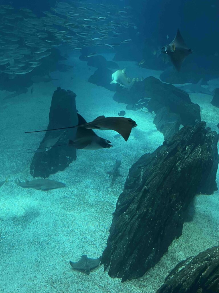 Jedním z vrcholů našeho výletu byla návštěva Oceanaria v moderní čtvrti Parque das Nações. To místo dokáže probudit nejen dětský, teenagerský, ale i dospělý úžas – obrovské akvárium plné žraloků, mant a těch všech barevných ryb, prostředí světla, ticha a klidu.